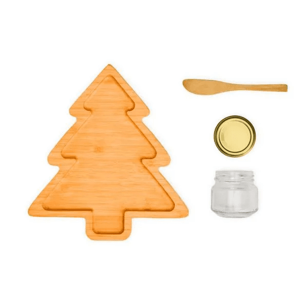 Composto por petisqueira em formato de pinheiro e espátula de 14 cm em Bambu; pote de vidro 120ml com tampa.