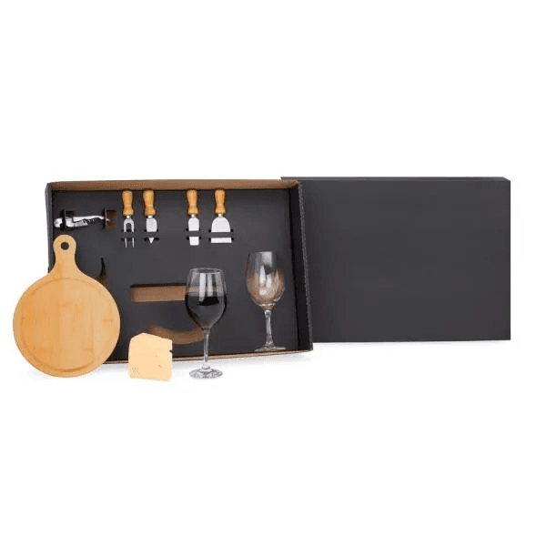 Conta com tábua para queijo/petiscos; Duas facas, sendo, uma com ponta e outra reta, garfo e espátula em madeira/inox; Duas taças para vinho em vidro e abridor em metal. Estão perfeitamente acomodados em uma caixa para presentear.
