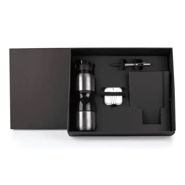 Kit composto por squeeze fumê revestido em aço inox de 750ml e acompanha copo rosqueável 200ml. Conta também com fone de ouvido branco; caderno para anotações preto com capa dura e caneta esferográfica em ABS prata.