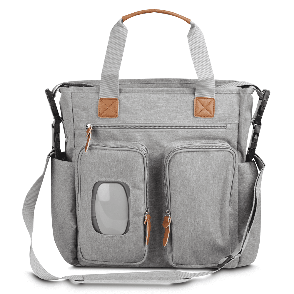 Bolsa multifuncional em poliéster 300D com detalhes em PU e interior em 210D. Possui 2 compartimentos laterais, 3 bolsos frontais com zíper, 1 na parte oposta com fechamento em velcro, incluindo um específico para lenços umedecidos. Conta com alças de ombro e de mão com acabamento em PU, além de interior espaçoso com divisórias e fechamento em zíper. Prática e organizada para o dia a dia.