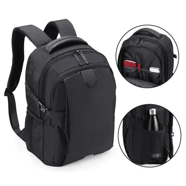 Mochila preta em Polyester / PU. Conta com alças para as costas com faixa refletiva e bolso, alça para as mãos, alça para pendurar e alça carona para mala. Na parte externa conta com saída para fio, faixa refletiva, borrachão, dois fechos laterais, dois bolsos laterais com tela, bolso frontal e dois bolsos na parte superior com fechamento em zíper. Na parte interna do primeiro bolso, conta com 4 compartimentos. No bolso principal, conta com compartimento aveludado para notebook de até 15" e mais um compartimento.
