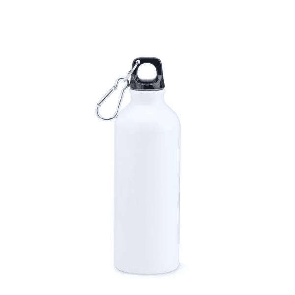 Squeeze branca em alumínio revestido com verniz. Possui tampa em polipropileno rosqueável, argola com mosquetão e anel em silicone para vedação.