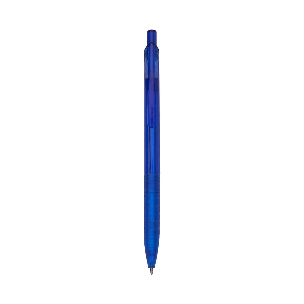 Caneta plástica translúcida com carga esferográfica azul e acionamento por clique.