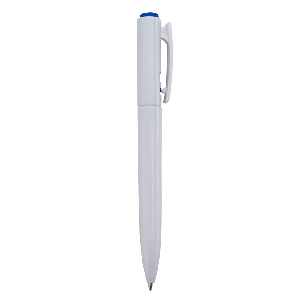 Caneta plástica com carga esferográfica azul 1.0 mm e acionamento por clique.
