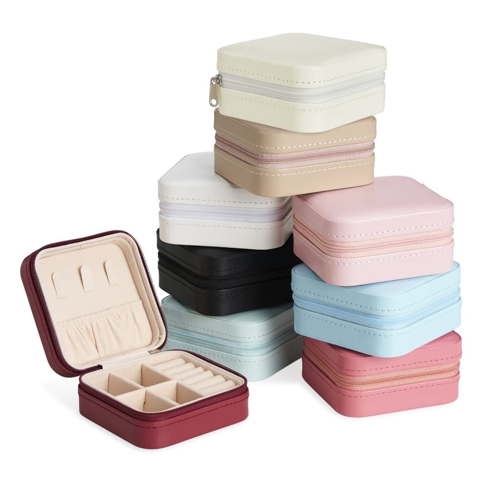 Porta-joias de couro sintético com revestimento aveludado. Possui compartimentos internos para anéis, brincos, pulseiras e colares.