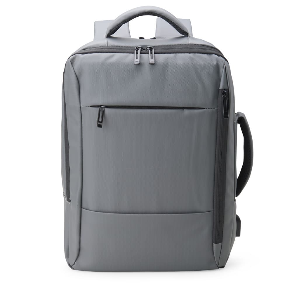 Mochila em couro sintético 23 litros resistente à água com quatro compartimentos, sendo o principal com bolso para notebook 15,6 e tablet 10. Com divisórias internas para acessórios, a mochila possui suporte externo usb, alça para encaixe em malas de viagem e duas alças de mãos, sendo uma delas lateral para o transporte da mochila no modo pasta.