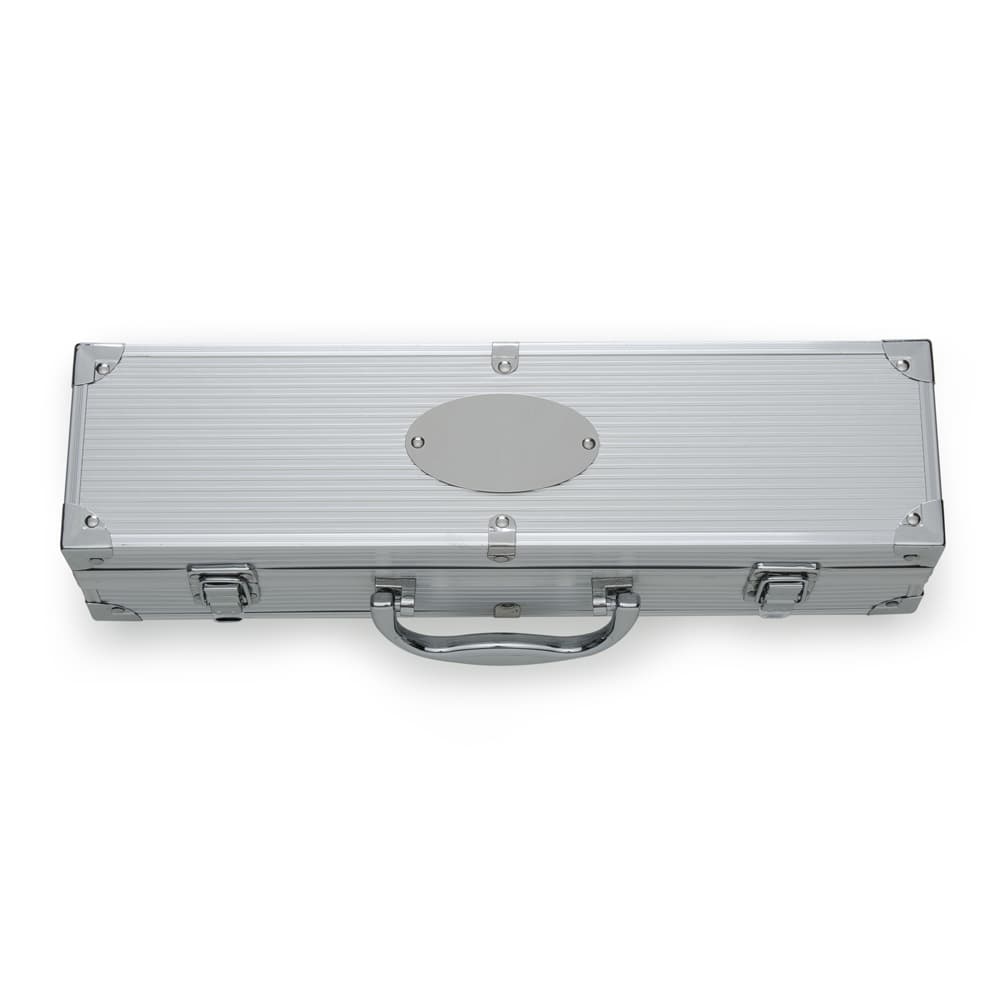 Kit churrasco 3 peças em maleta de alumínio com relevo. Possui: faca, garfo e pegador em inox(todas peças possuem proteção plástica) detalhes em metal nas bordas da maleta, duas dobradiças na parte inferior, uma alça e duas presilhas para travar/abrir maleta. Parte interna revestida de tecido tnt e velcro para guardar as peças." observação: Maleta 11,9 cm x 37 cm x 7,8 cm – Faca 32,5 cm x 2,4 cm – Garfo 34,6 cm x 3,3 cm – Pegador 34,3 cm x 6 cm