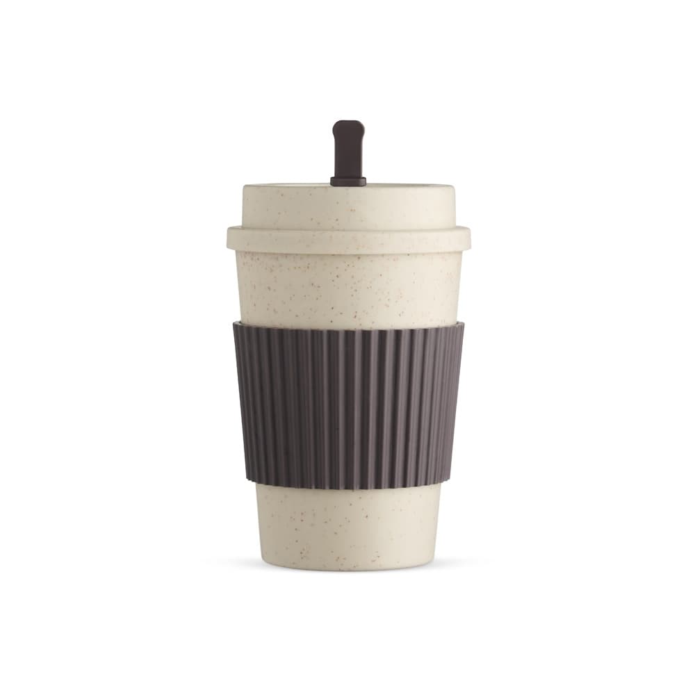 Copo Fibra de Trigo 450ml com tampa rosqueável. Acompanha mexedor e manga protetora antiderrapante.