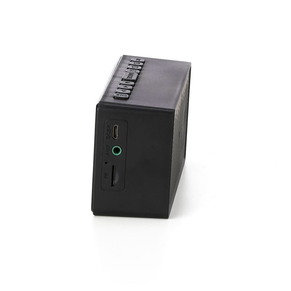 Caixa de som multimídia com relógio despertador e suporte para celular. Produzida em plástico e com borrachas antiderrapantes na área inferior, a caixa de som tem a área frontal com display de LED, além de um compartimento com suporte para celular – uma espécie de “gaveta” aonde é exibido (MUSIC), basta puxá-la ter acesso ao compartimento. A caixa de som executa nos modos bluetooth, cartão TF-microSD e entrada auxiliar P2. Acompanha cabo USB e manual em inglês.