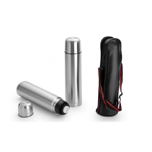 Garrafa térmica 1L em inox com tampa rosqueável, tampa interna em plástico resistente(basta um clique para abrir ou fechar). Acompanha capa protetora de couro sintético com alça em nylon e detalhe vermelho.