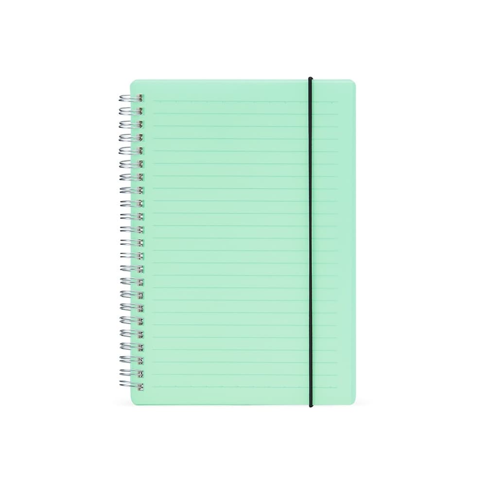Caderno A5 com capa plástica e elástico para lacre, contém aproximadamente 80 folhas marfim com pauta.