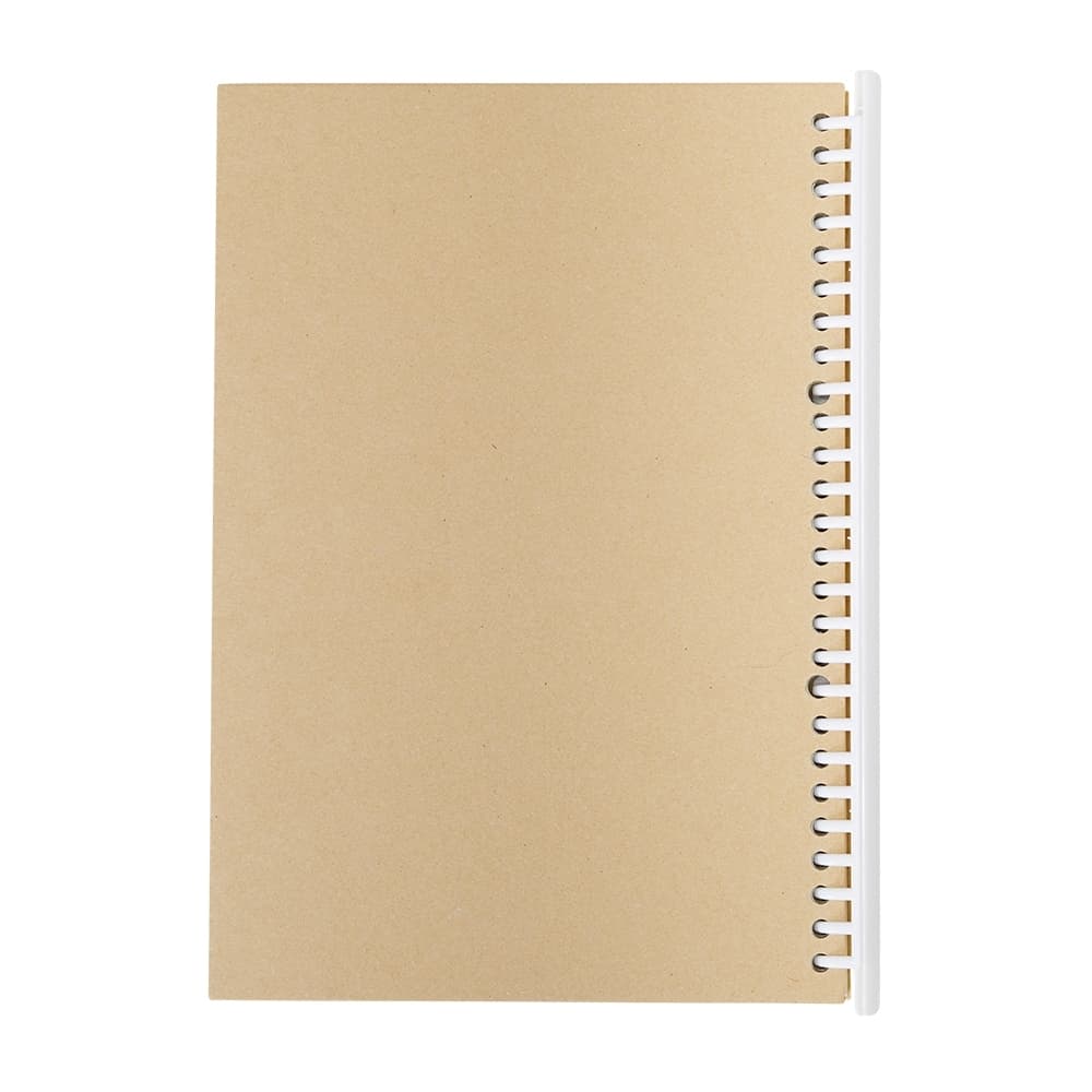 Caderno B5 com capa dura em kraft e espiral removível, contém aproximadamente 90 folhas marfim com pauta.