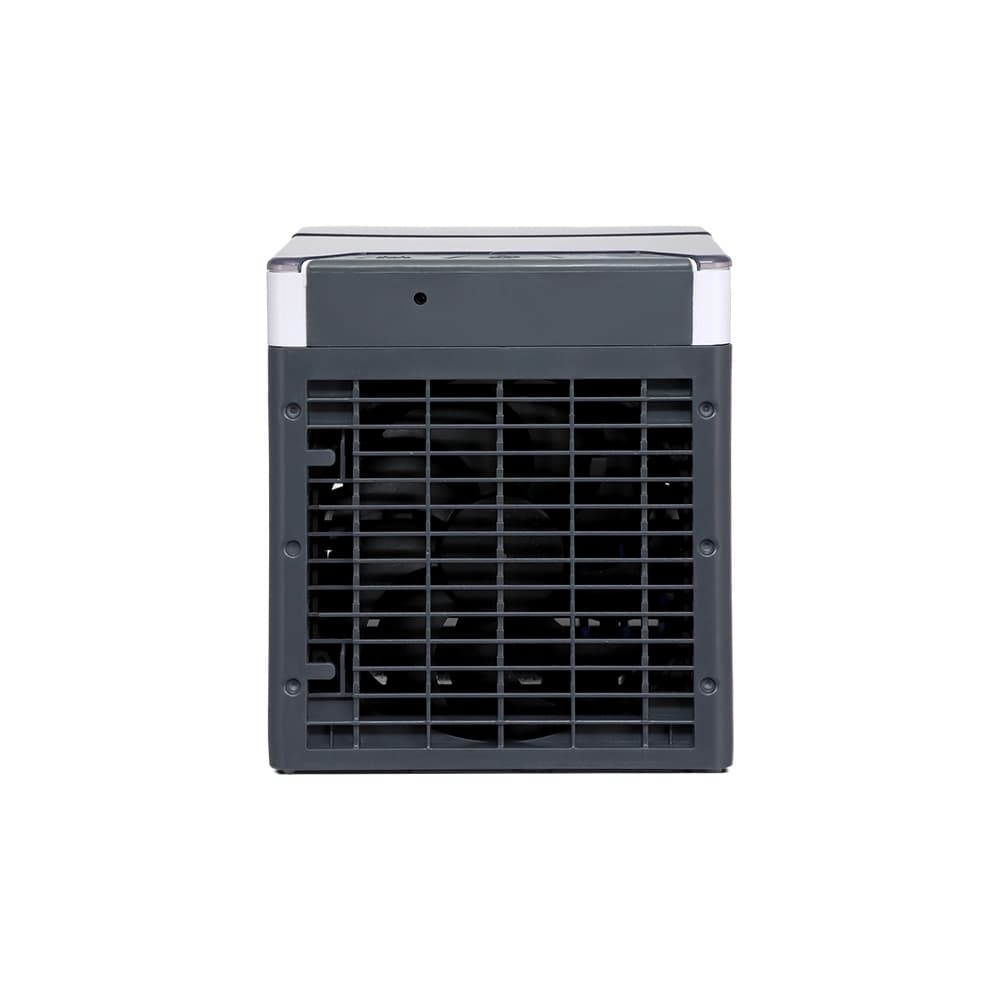 Mini climatizador de ar portátil multifunções, possui reservatório de água de 500ml, três níveis de potência, oscilação vertical com regulagem manual e luzes LED RGB. Pode ser usado como climatizador, ventilador e umidificador.