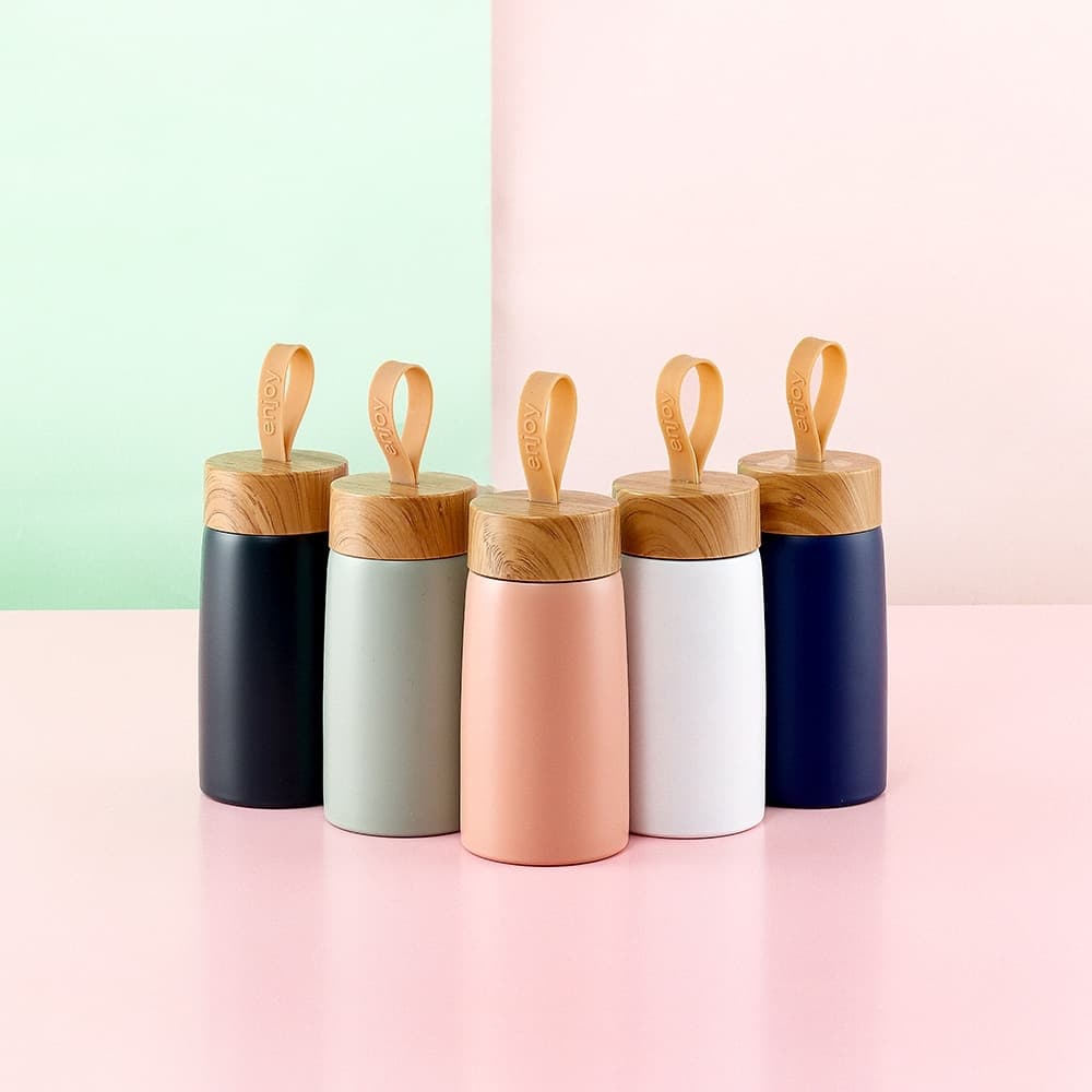 Garrafa inox 304 com parede dupla, capacidade de 250ml. Contém tampa plástica com design de bambu e alça de silicone para transporte.