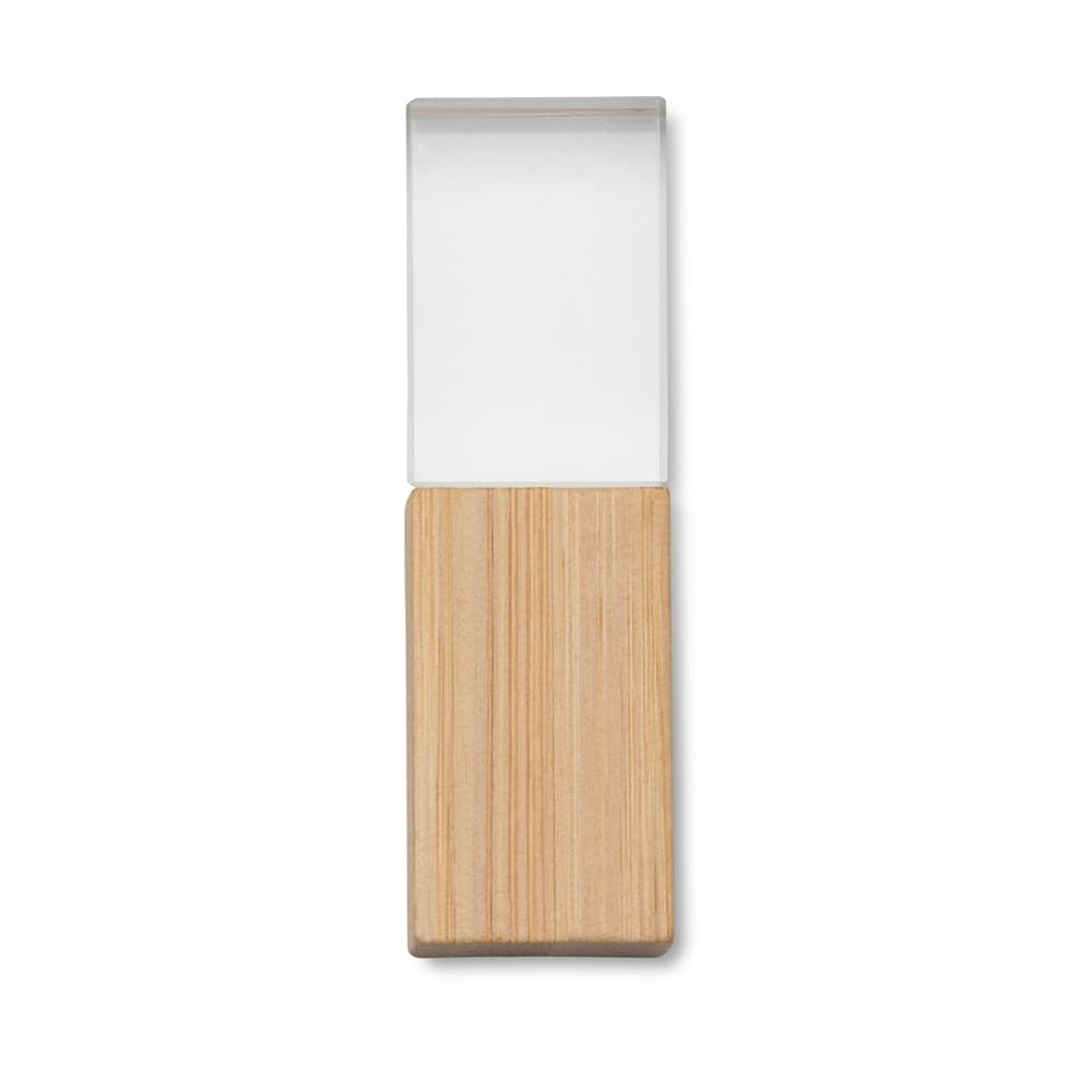 Pen drive de cristal com tampa e detalhe em bambu. Capacidades de 4GB, 8GB e 16GB.