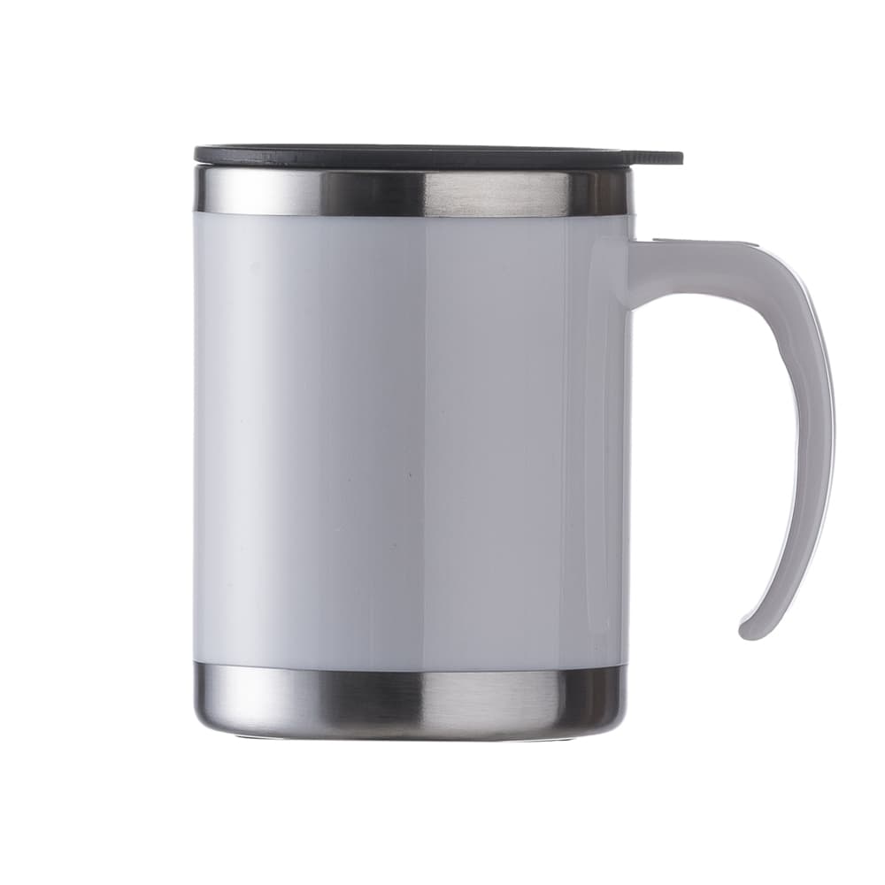 Caneca acrílica 400ml com detalhe oval no pegador, revestimento interno e detalhes em inox. Tampa plástica resistente com sistema giratório para abertura(não é térmica).