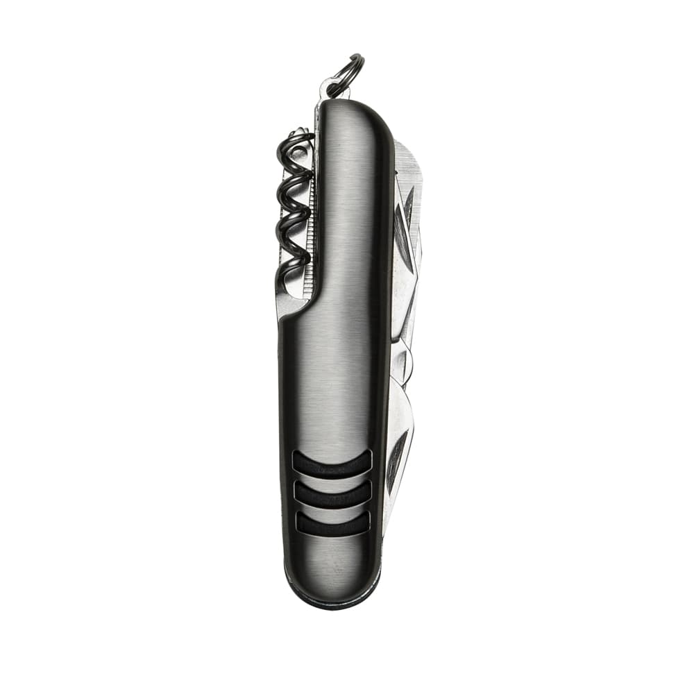 Canivete metal 9 funções com detalhes emborrachados preto(três linhas frente e verso). Possui: lâmina de corte, serrilha, mini tesoura, abridor de latas, abridor de garrafa, chave phillips, lixa, agulha de sutura e saca-rolhas. Acompanha bainha em nylon.