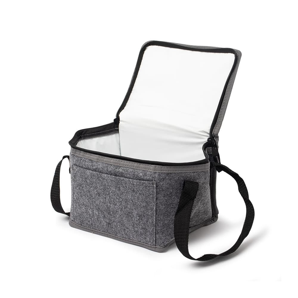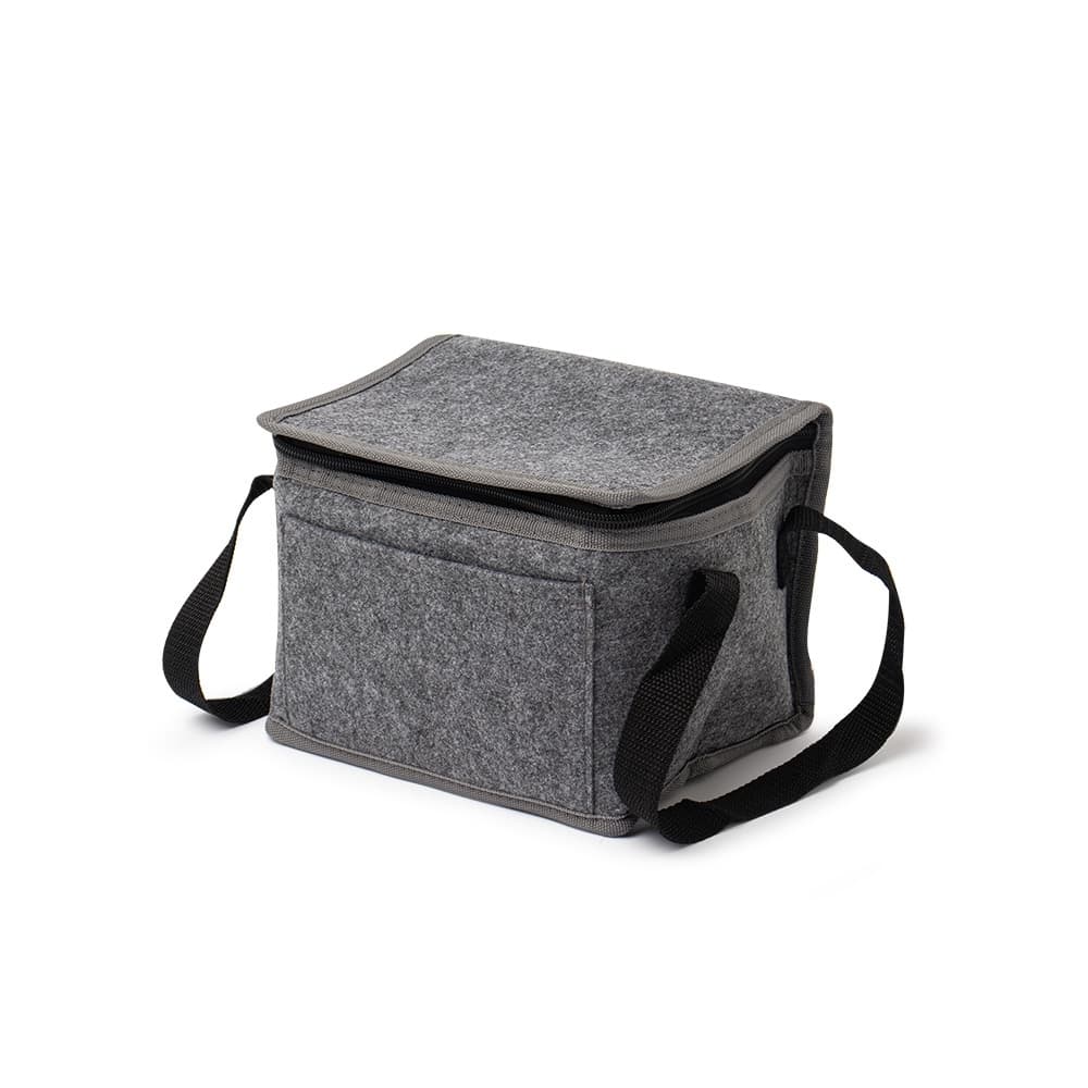 Bolsa térmica feita em feltro com capacidade para 5 litros, possui revestimento térmico, bolso frontal e alças para as mãos.