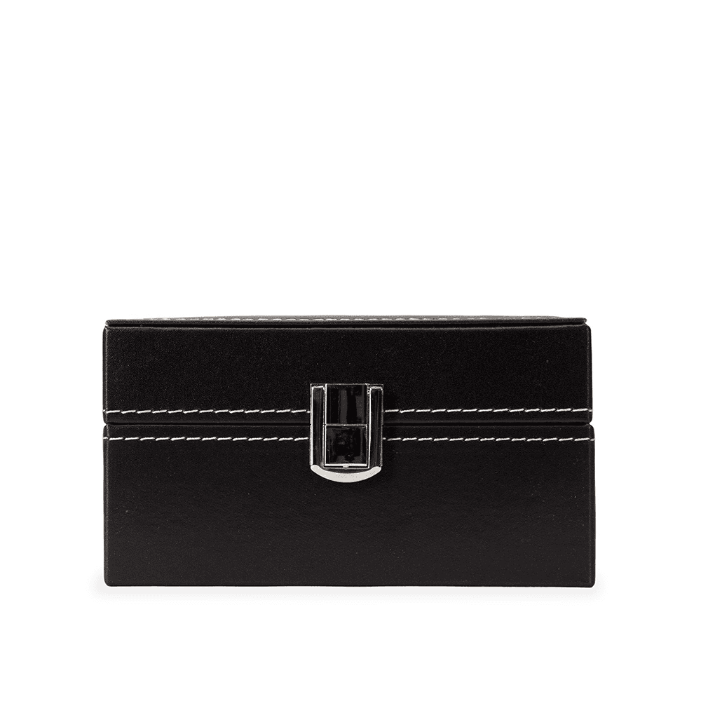 Porta-relógios com acabamento em couro sintético à base de PVC. Apresenta revestimento interno aveludado e três compartimentos fixos com almofadas removíveis de espuma, além de viseira em vidro e trava de segurança para o fechamento do estojo.