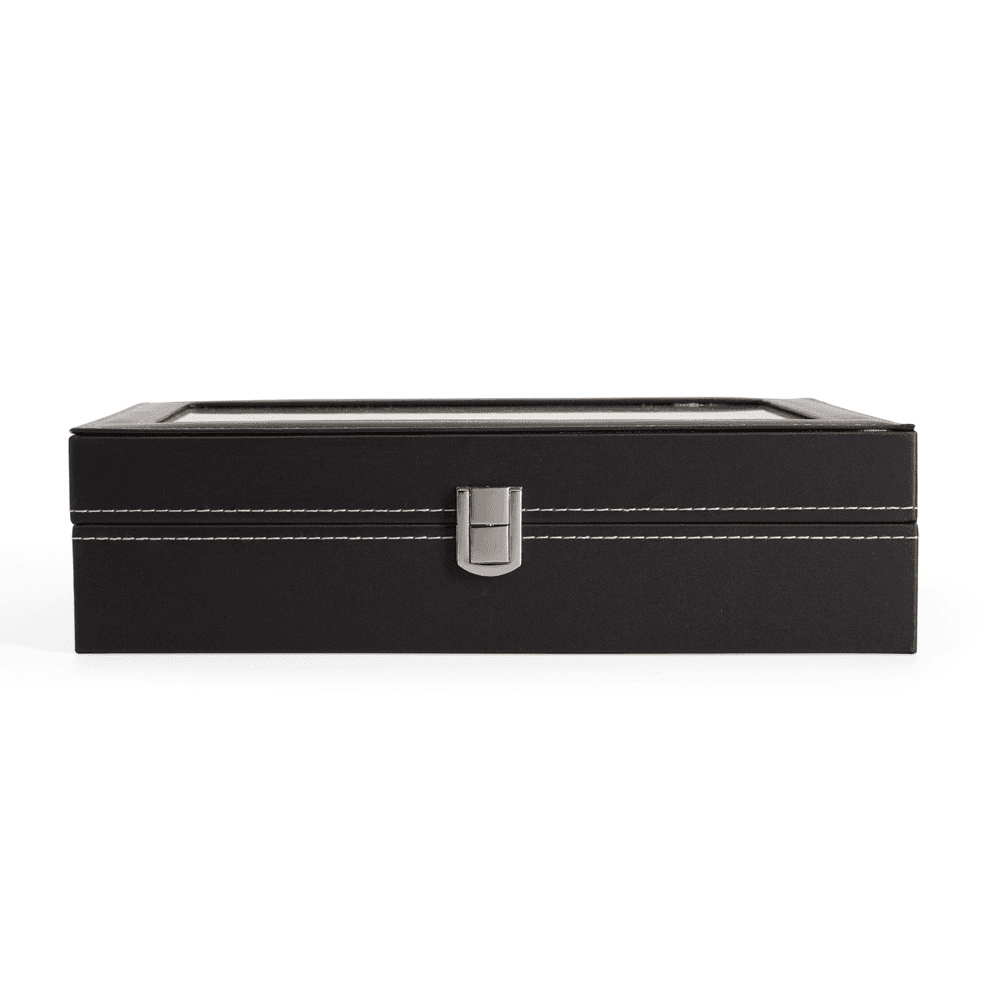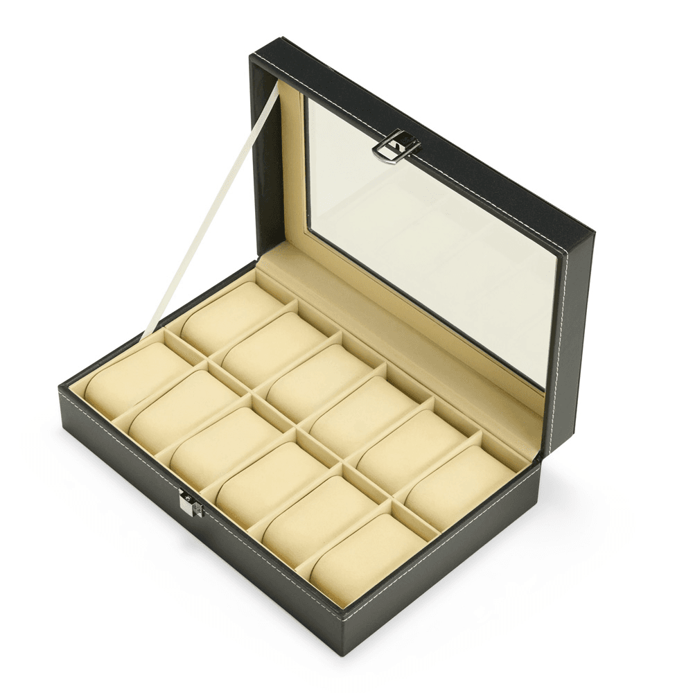 Porta-relógios com acabamento em couro sintético à base de PVC e revestimento interno em veludo. Conta com 12 compartimentos fixos com almofadas removíveis em espuma, além de visor feito em vidro e trava de segurança para fechamento do estojo.