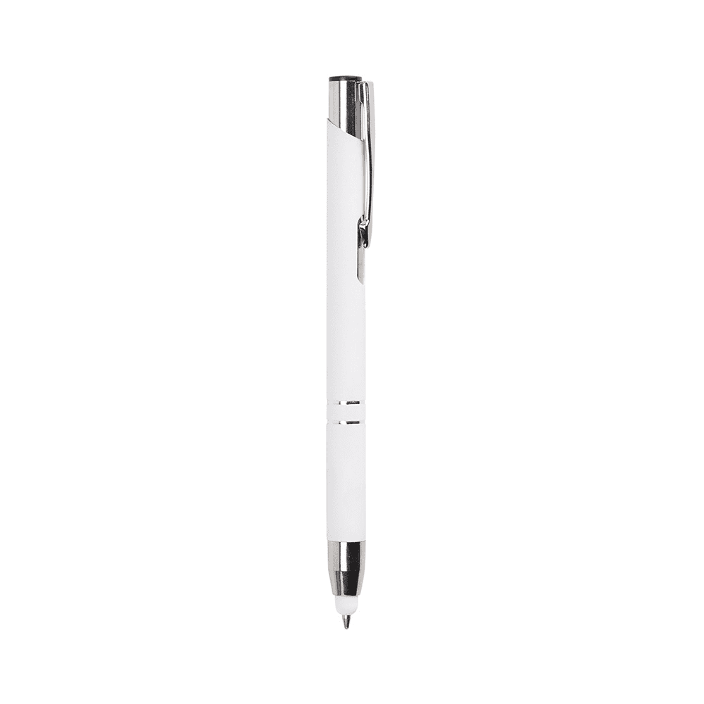Caneta esferográfica com carga azul de 1.0mm e acionamento por clique. De construção metálica, também possui ponteira emborrachada que permite seu uso como uma caneta touch para interação com dispositivos de tela sensível ao toque.