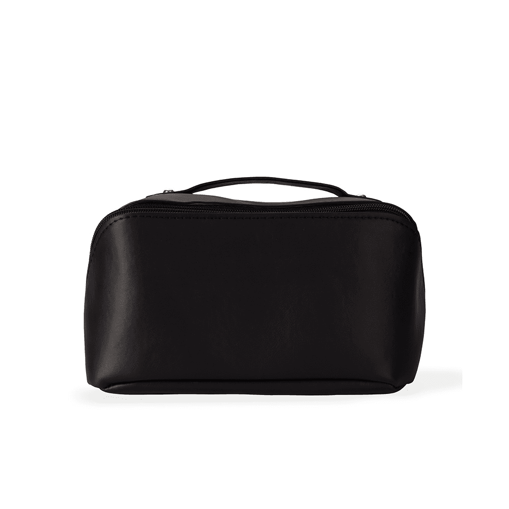 Nécessaire confeccionado em poliuretano (PU) impermeável com abertura em 180 graus que remete ao formato de uma concha. Possui amplo compartimento interno com dois bolsos laterais abertos e um central com fechamento em zíper. Contém uma alça para transporte.
