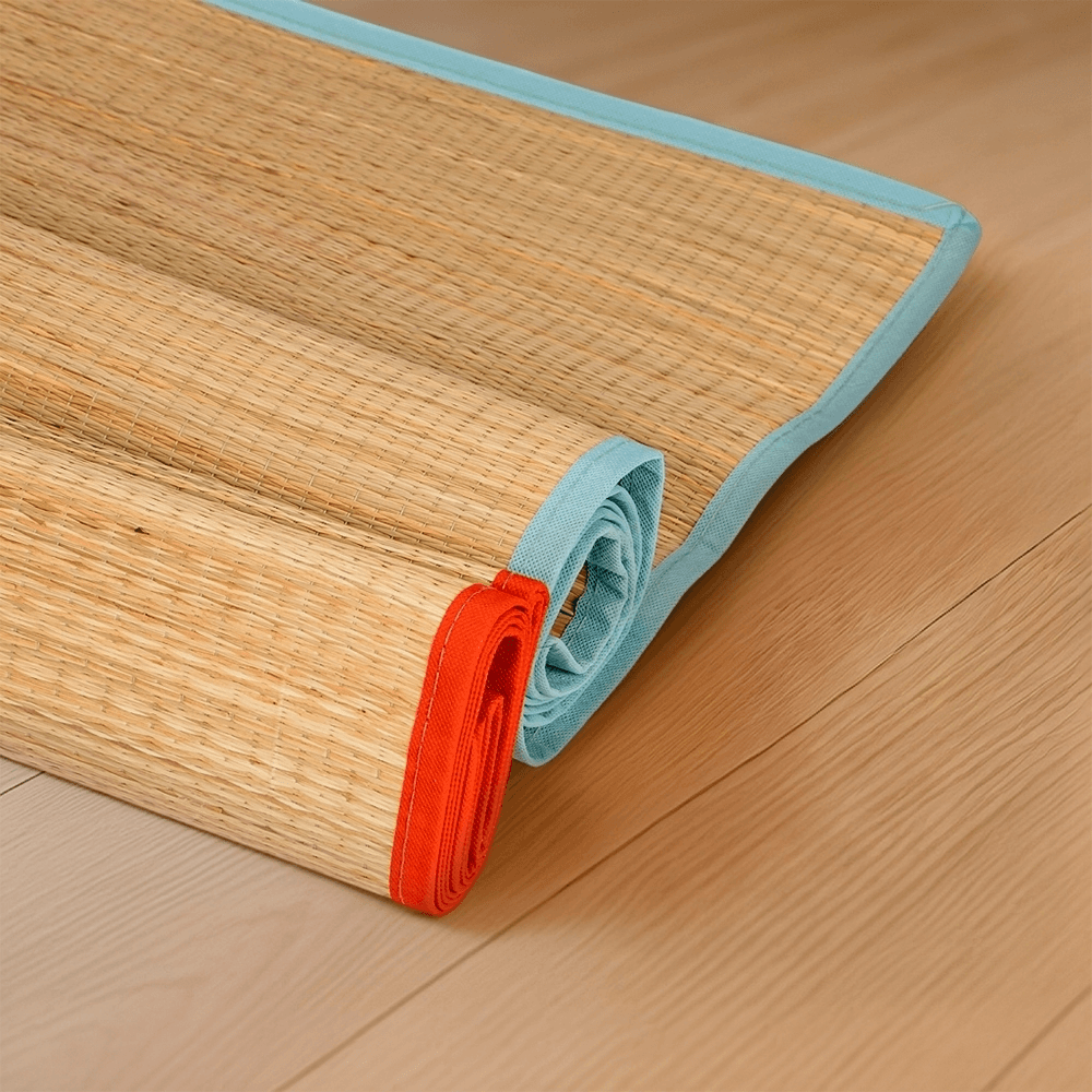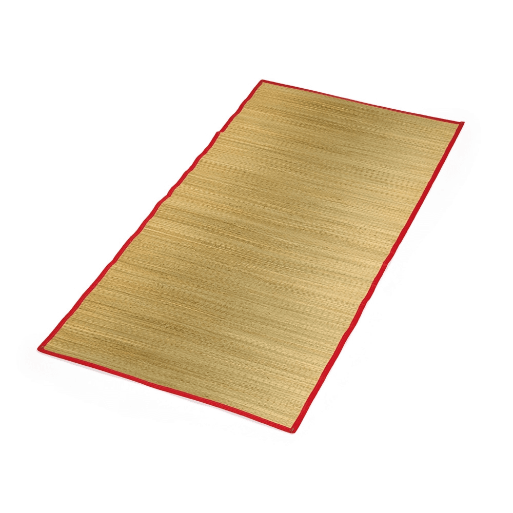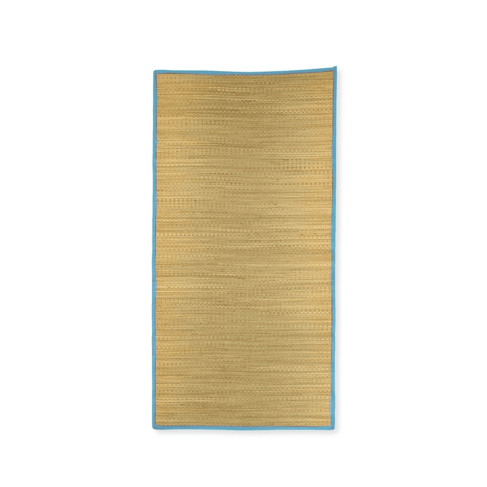 Esteira leve feita em palha sintética com bordas costuradas em nylon. Acompanha saco de nylon com seção telada, cordão de fechamento e alça regulável para transporte.