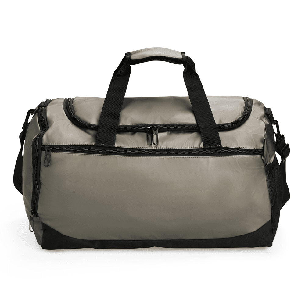 Bolsa em couro sintético impermeável, com detalhes em malha e capacidade de até 26 litros. Apresenta três compartimentos em diferentes tamanhos, incluindo espaço tênis, além de bolso lateral em tela de nylon com elástico. Possui duas alças de mão com suporte de velcro e alça transversal.
