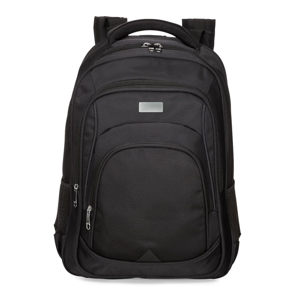 Mochila de poliéster 42 litros com três compartimentos, sendo o principal com bolso para notebook 156. Com divisórias internas para acessórios, a mochila possui bolsos laterais em malha, alça para encaixe em malas de viagem, alças de compensação, duas alças de mãos e área costada com revestimento espumado. Acompanha plaquinha metálica.