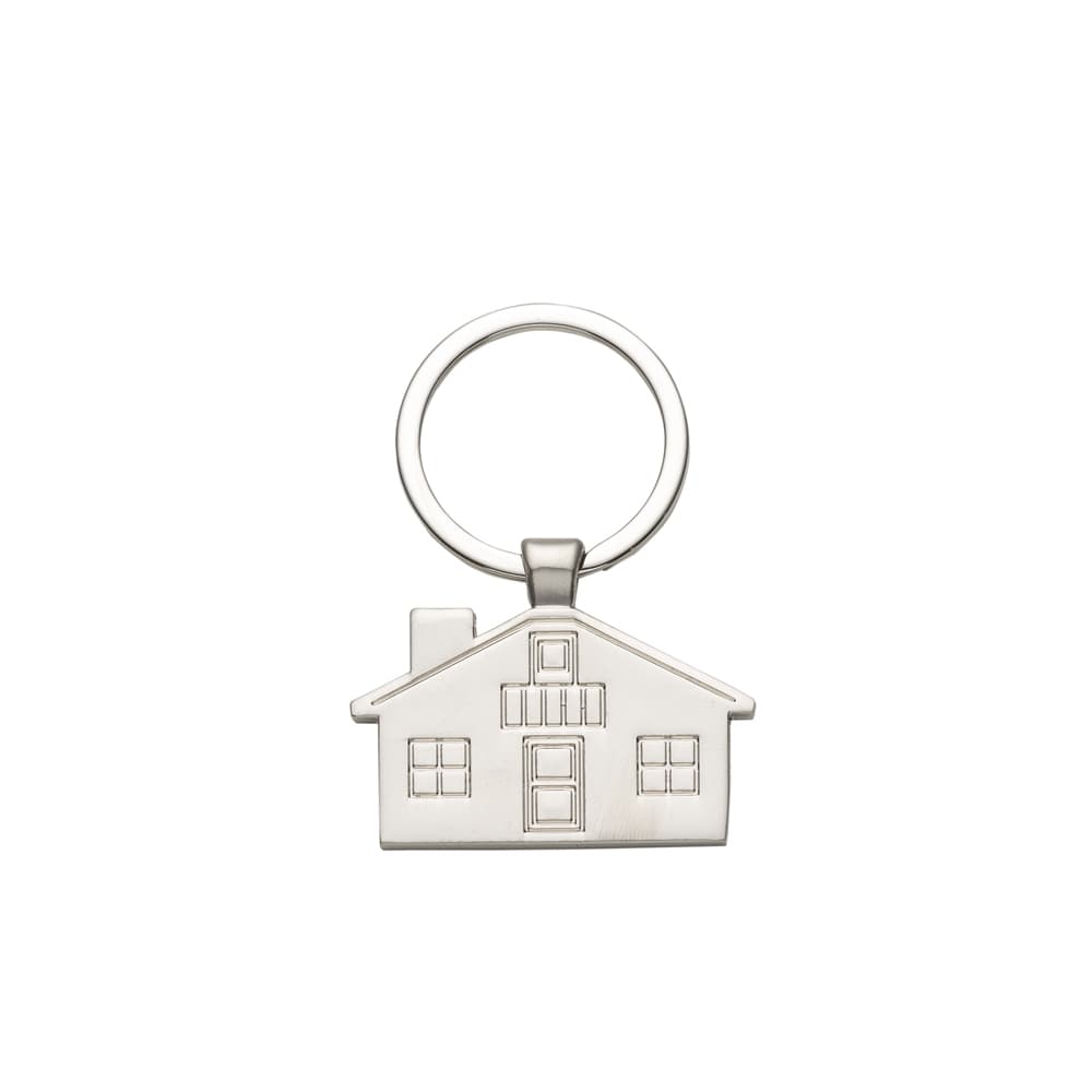 Chaveiro metal fosco formato casa. Parte frontal com desenho em relevo das janelas e portas, verso com um retângulo no centro ideal para personalização.