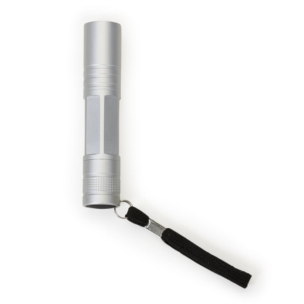 Mini lanterna de alumínio com cordão e um Led. Acionador emborrachado e cordão de nylon ficam na tampa de rosca(parte traseira), possui detalhes quadriculados em relevo. Centro possui seis detalhes retos ideais para personalização seguidos de três anéis em relevo. Utiliza uma pilha AA(não acompanha).
