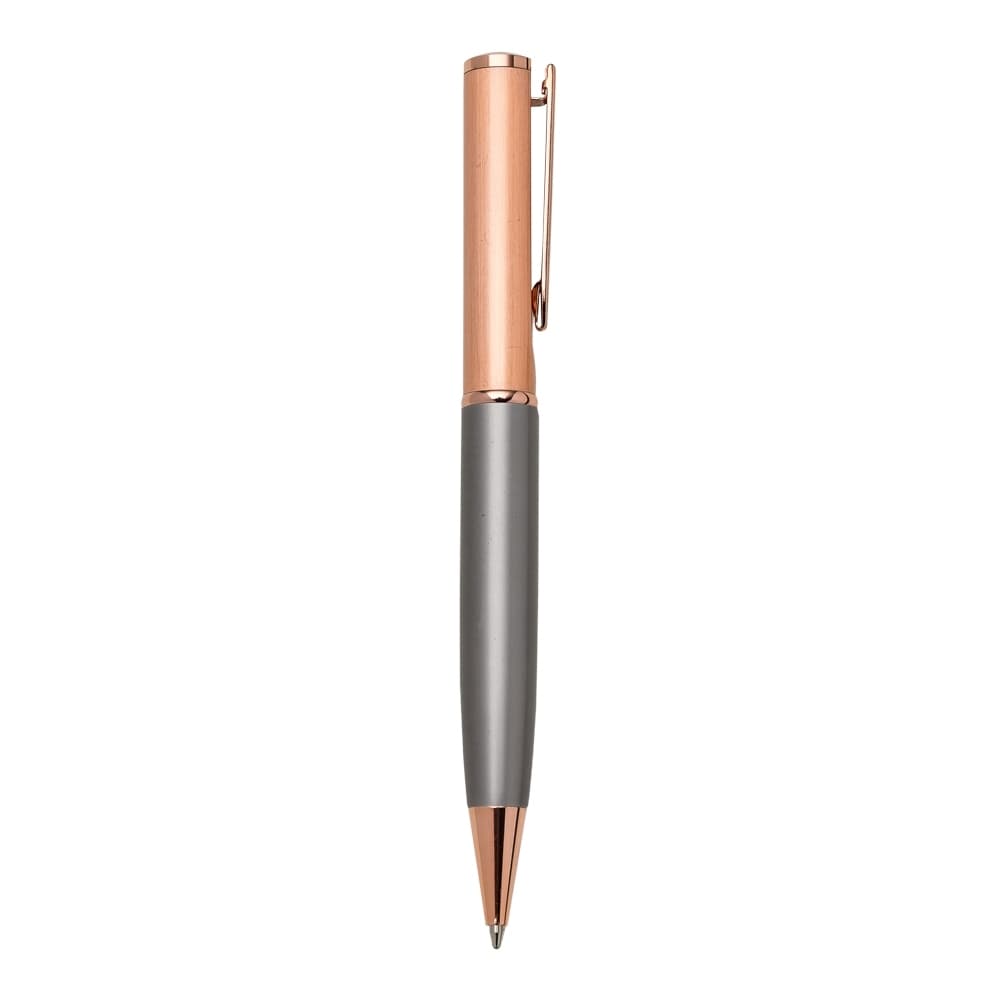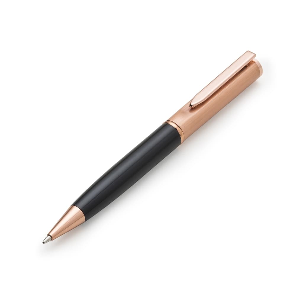 Caneta metal cobre com detalhe inferior colorido. Clip metal com e detalhe circular na ponta superior, possui anel central, carga esferográfica azul 1.0 mm com acionamento por giro.