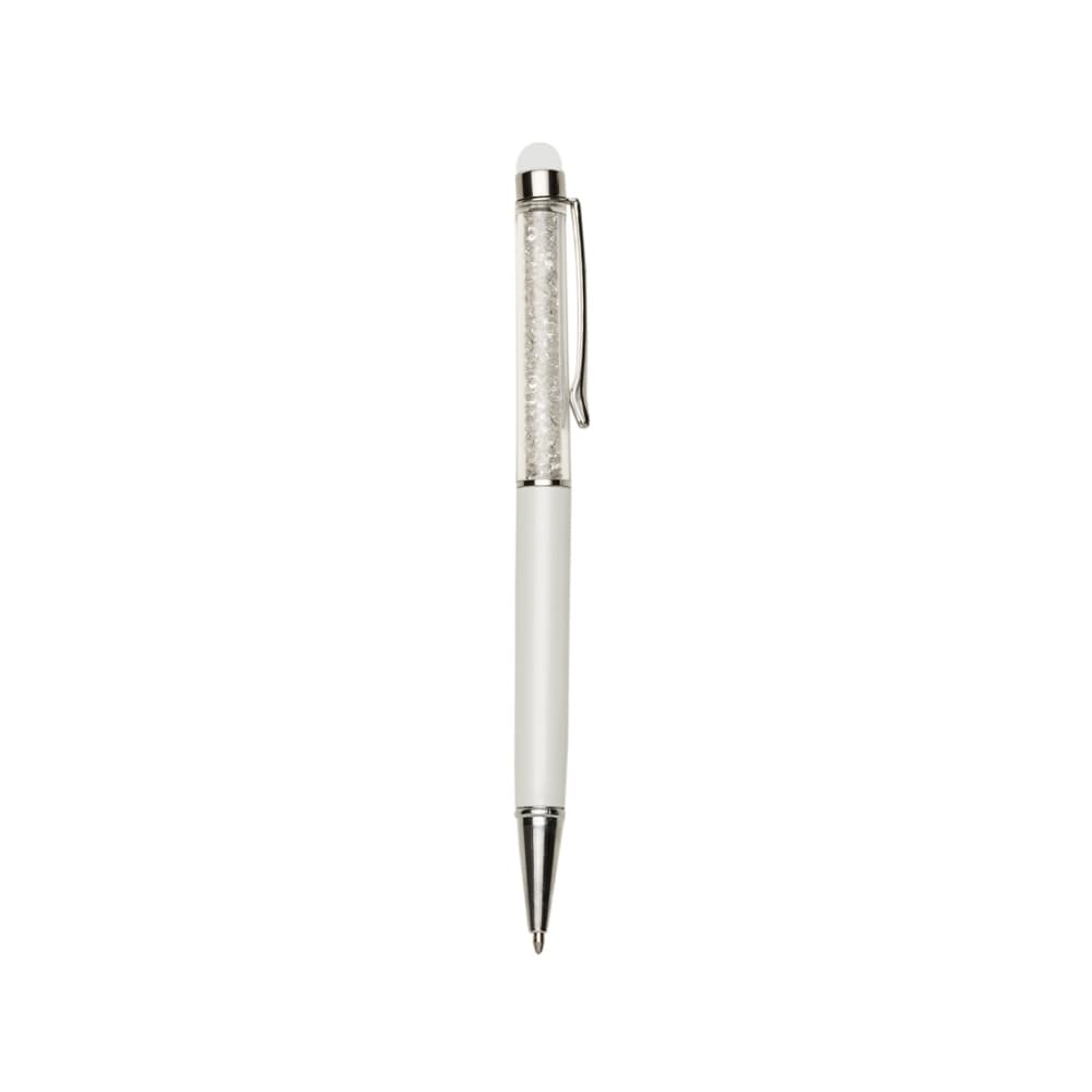 Caneta metálica com touch screen e detalhes em cristal, carga esferográfica azul e acionamento por rotação.