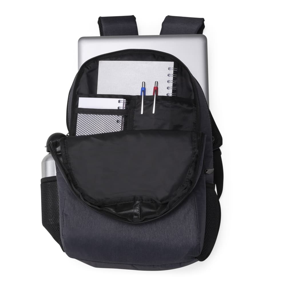 Mochila confeccionada em poliéster com compartimento para notebook até 15,6 polegadas. Contém compartimento grande, compartimento mediano com divisórias e bolso telado, compartimento frontal e bolsos laterais em malha. Alça de mão com revestimento espumado, alças para as costas ajustáveis e com revestimento espumado.