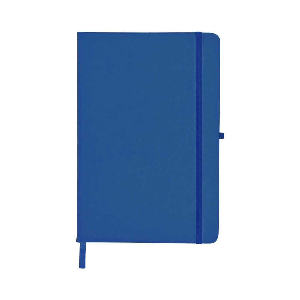 Caderneta emborrachada com porta caneta elástico em nylon, marcador de página em cetim e fita elástica de nylon para fechar. Contém aproximadamente 80 folhas pardas pautadas.