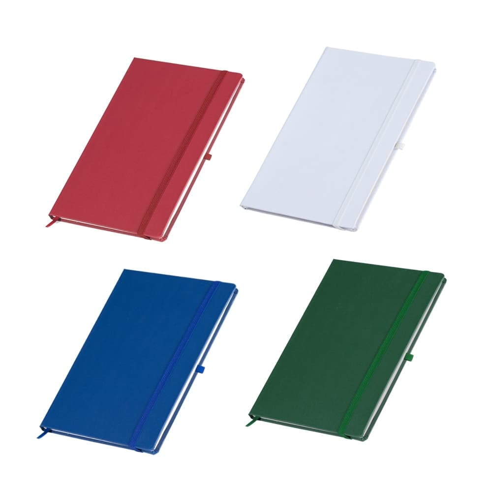Caderneta em percalux com marcador de página em cetim e fita elástica para fechar. Contém aproximadamente 80 folhas sem pauta.