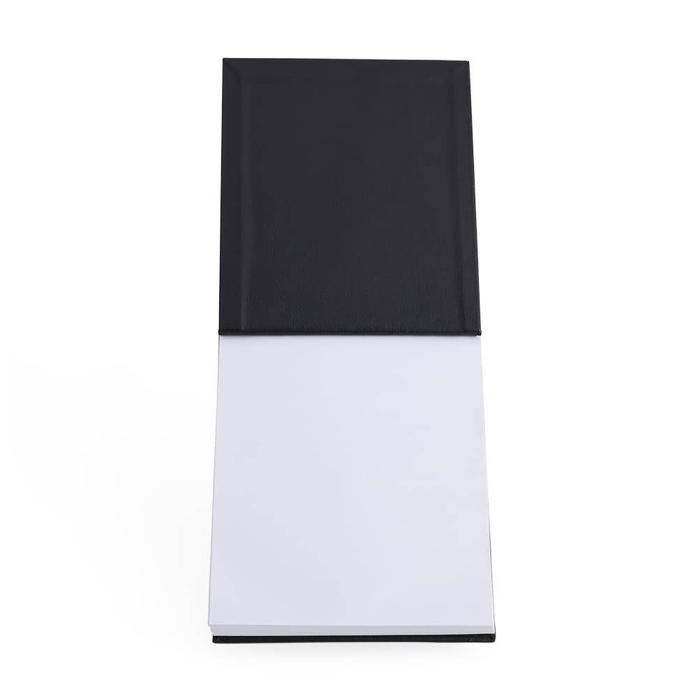 Bloco de anotações em couro sintético com porta caneta. Possui aproximadamente 100 folha brancas sem pauta.