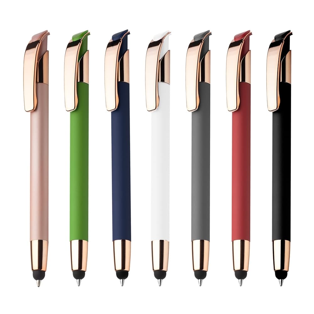 Caneta touch screen em alumínio reciclado com acabamento similar à borracha. Acionamento por clique e carga esferográfica azul 1.0mm.