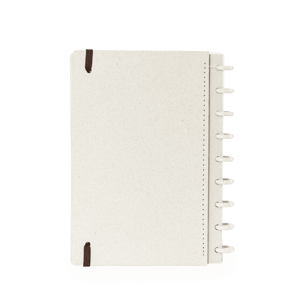 Caderno de capa dura em papel reciclado, com fechamento em elástico e encadernação em discos de fibra de arroz, que permitem adicionar ou retirar folhas compatíveis. Possui páginas dedicadas para dados pessoais, calendários de 2025 e 2026 e um manual para troca e retirada de folhas. Possui cerca de 80 folhas em papel reciclado pautadas.