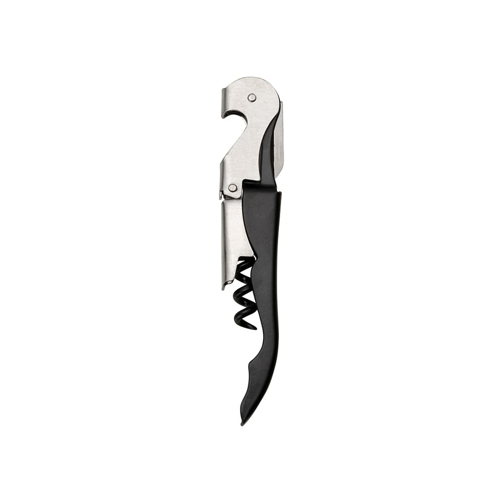Saca-rolhas metálico de 2 estágios com acabamento fosco. Contém abridor de garrafa, lâmina de corte e saca-rolhas.