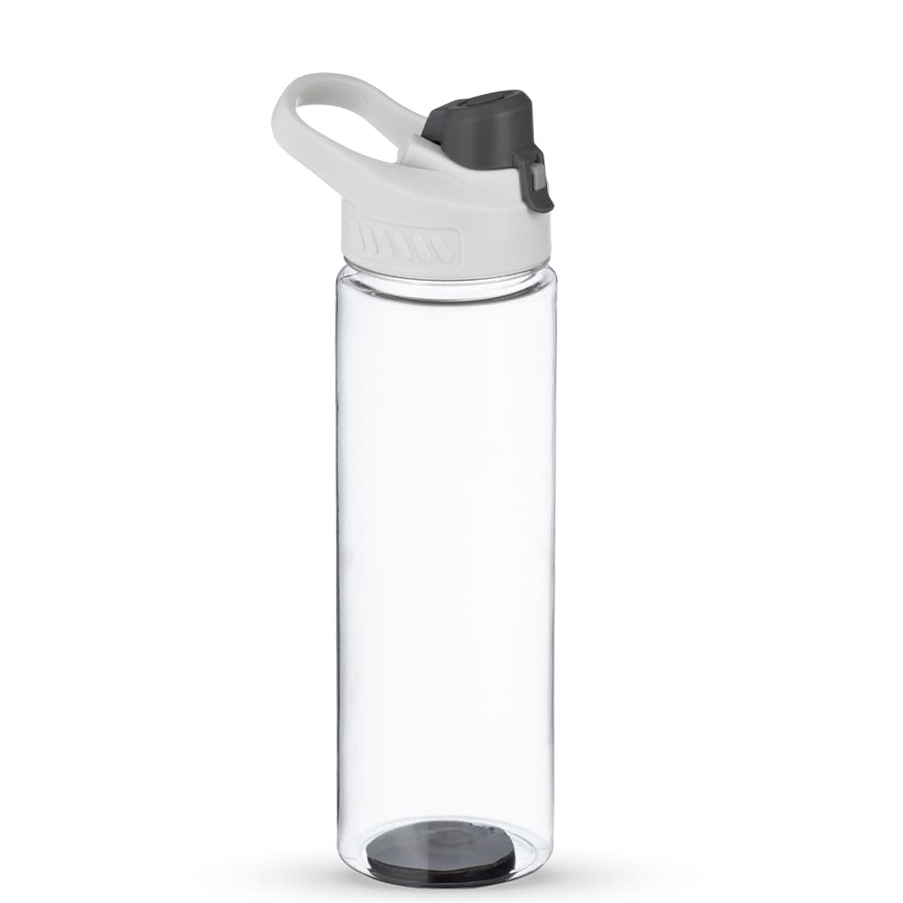 Squeeze plástico 700ml com alça para transporte, possui tampa principal rosqueável e tampa de proteção plástica com trava para o bocal.