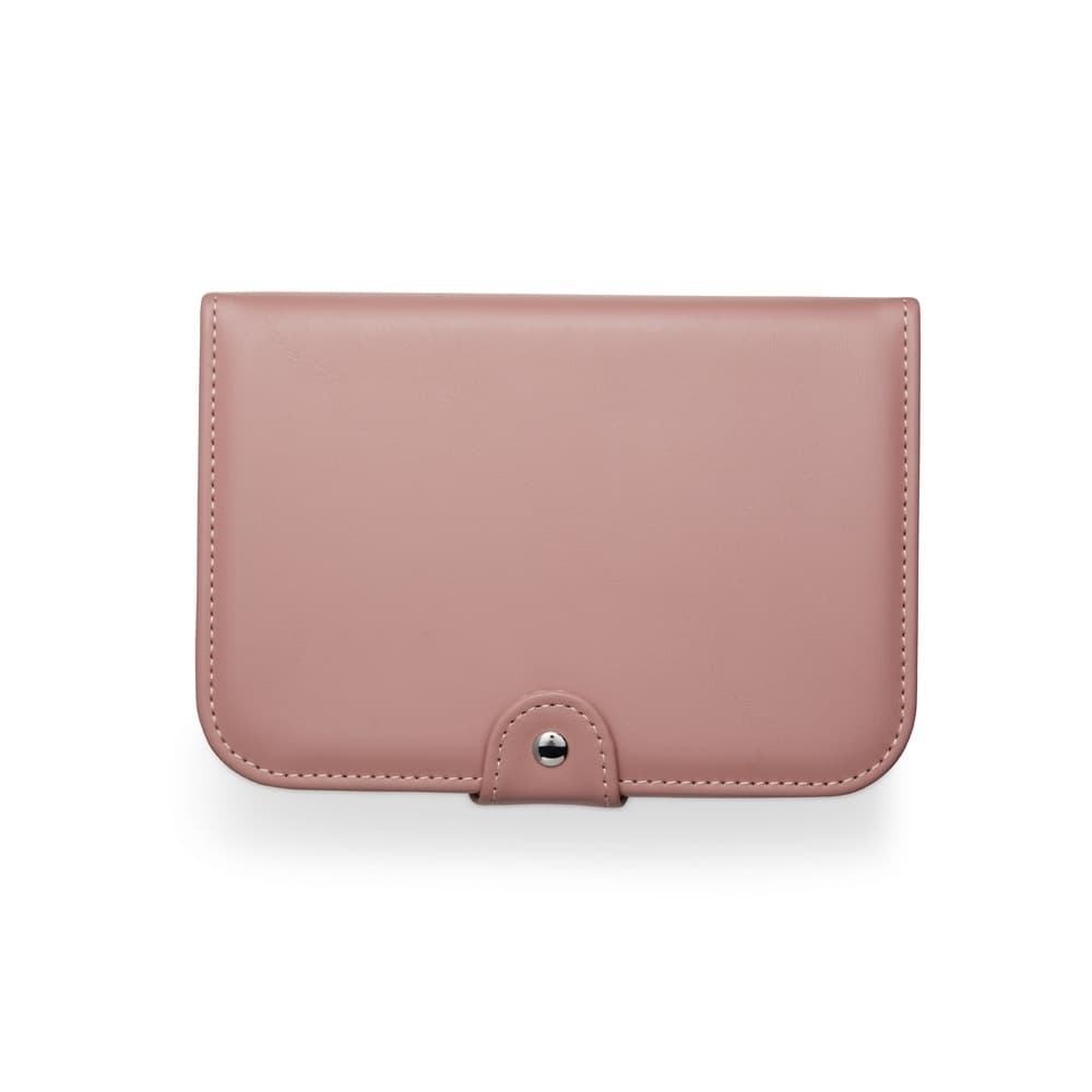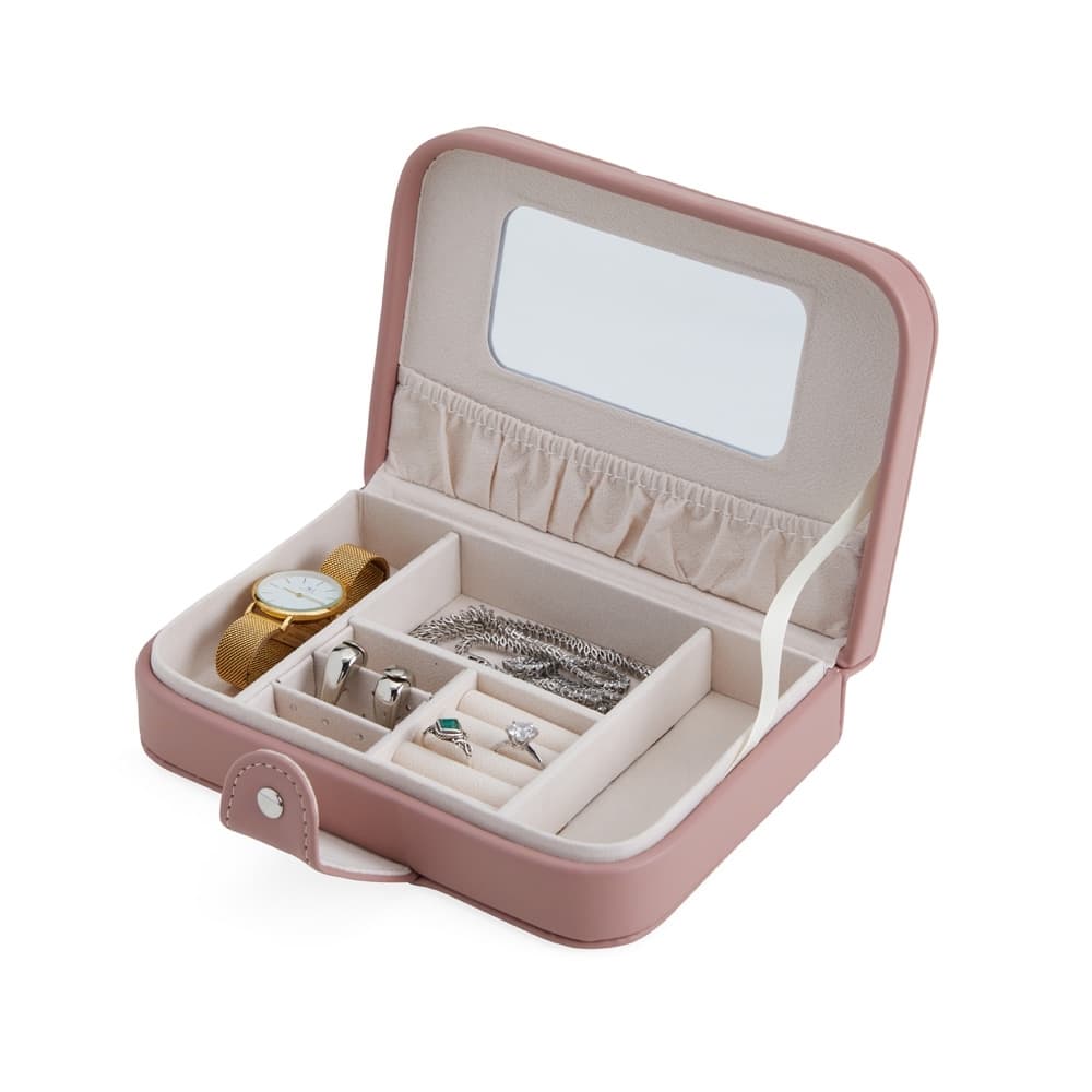 Porta-joias em couro sintético com revestimento aveludado e espelho. Possui compartimentos internos para anéis, pulseiras, colares e placas para brincos.