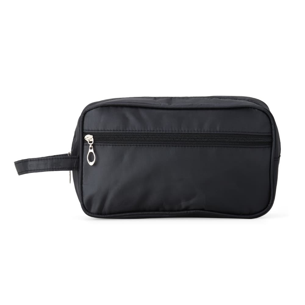 Nécessaire Poliéster resistente à água. Possui alça lateral, compartimento principal superior e outro frontal.