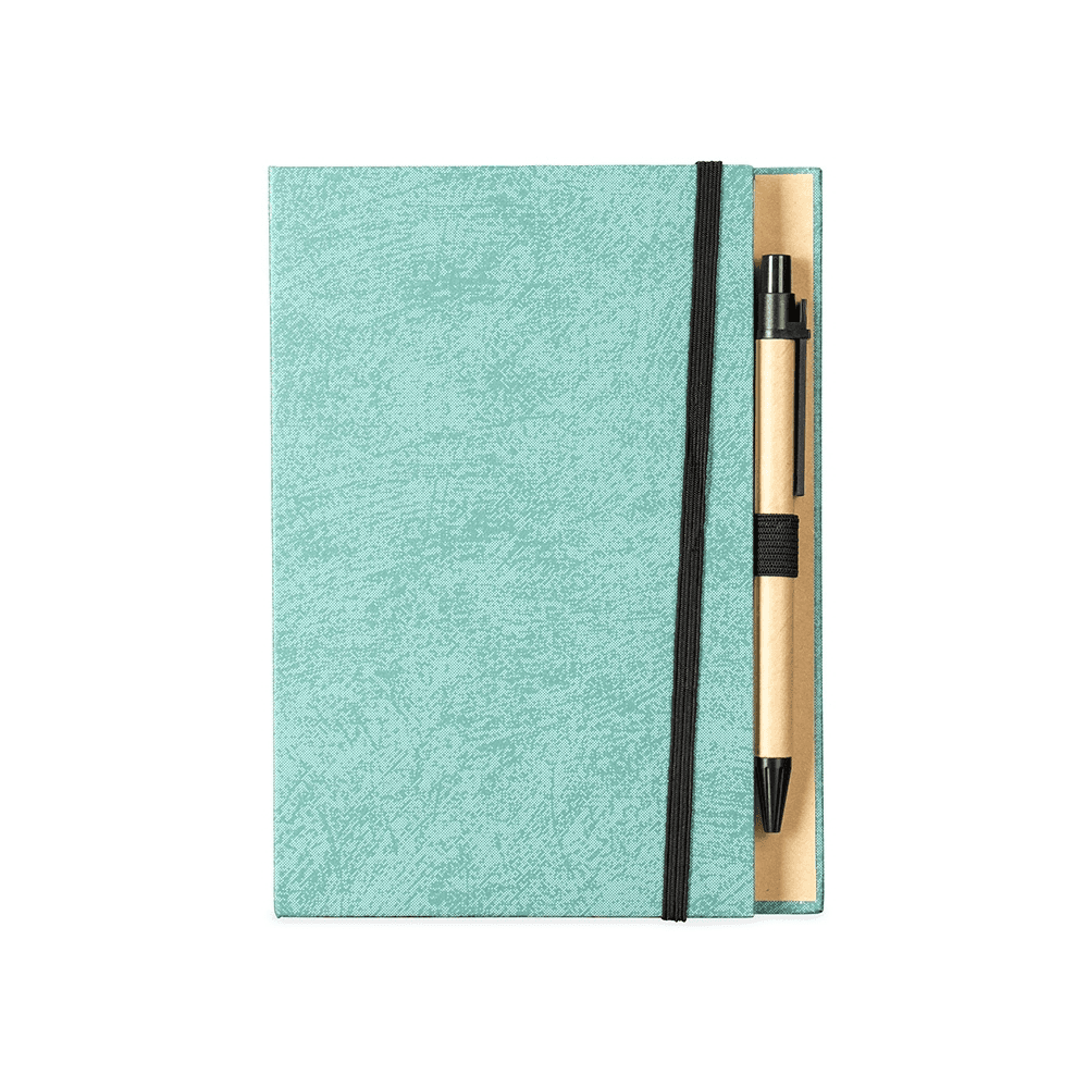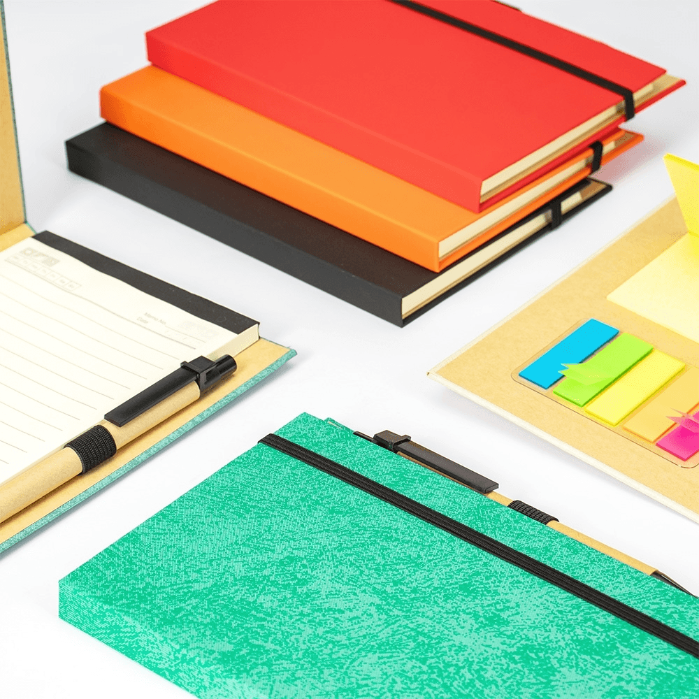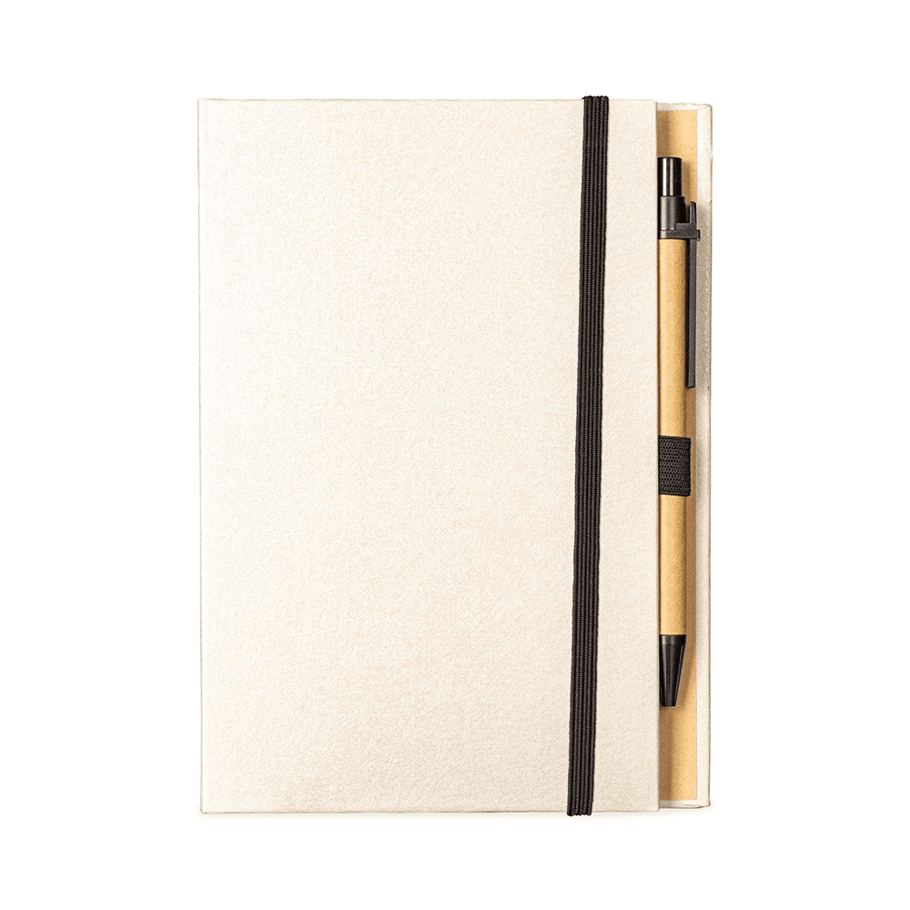 Um bloco de anotações com capa revestida em papel especial e fita elástica para fechamento. Contém aproximadamente 80 folhas amareladas destacáveis com pauta, além de um bloco com cerca de 20 folhas autoadesivas amarelas e aproximadamente 100 marcadores de página autoadesivos, divididos em cinco cores diferentes. Acompanha uma caneta esferográfica com carga azul de 1.0mm e acionamento por clique, corpo em papelão e demais componentes em plástico.