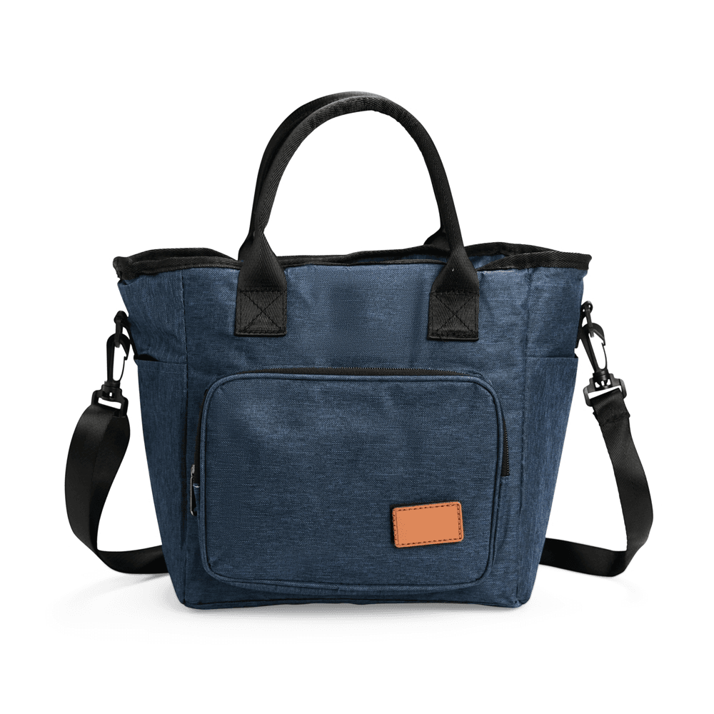 Bolsa térmica com capacidade de até 13 litros. Confeccionada em Oxford resistente à água, possui compartimento interno com revestimento térmico em PEVA e fechamento em zíper. Conta ainda com bolso frontal com plaquinha de couro sintético fixada com velcro, um par de bolsos laterais e duas alças fixas para transporte, além de uma alça transversal regulável com mosquetões para encaixe nas fivelas laterais da bolsa.