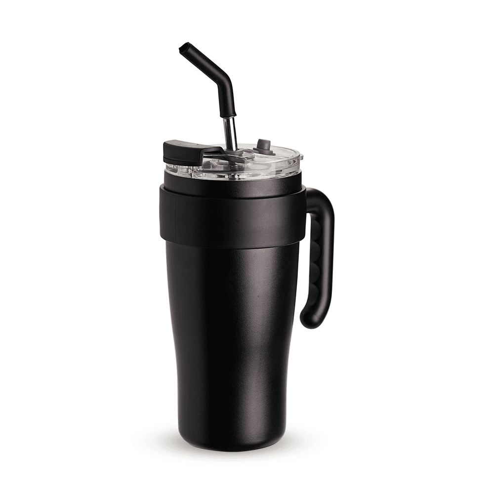 Caneca térmica em inox com capacidade máxima de 800ml. Possui estrutura em parede dupla, alça ergonômica em plástico, tampa rosqueável com vedação a vácuo, protetor para bocal e acesso para canudo com tampa em silicone. Acompanha canudo de inox com ponta de silicone removível.