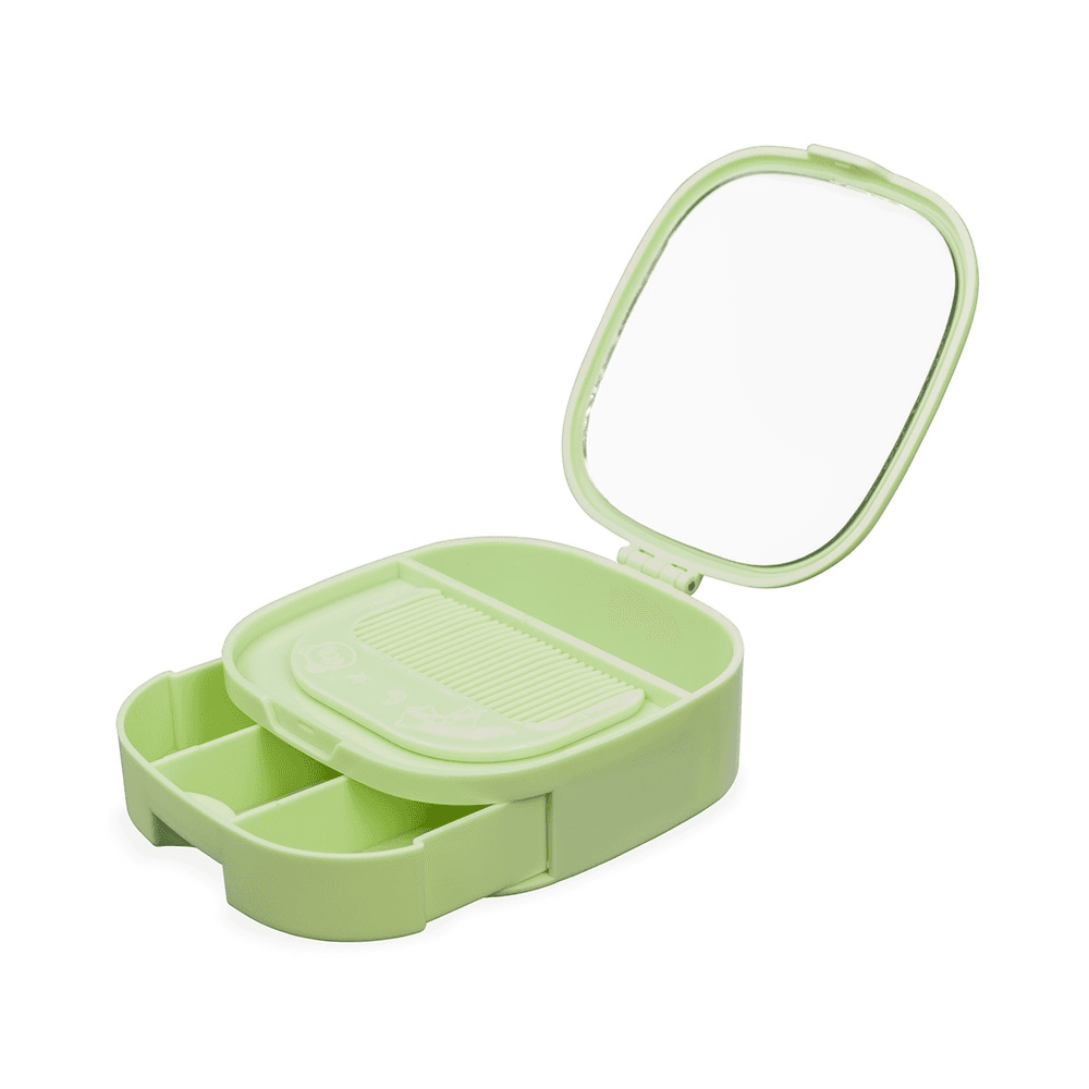 Este porta-joias feito em plástico é uma ótima opção para guardar objetos delicados com segurança. O organizador conta com espaço interno com dois compartimentos de tamanhos distintos e uma gaveta com três divisórias. Além disso, possui um espelho na parte interna da tampa, o que destaca sua versatilidade. Acompanha um pente compacto.