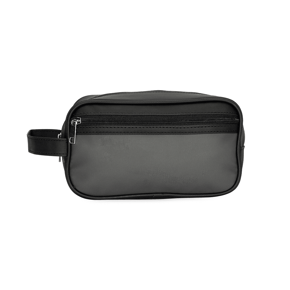 Nécessaire em couro sintético impermeável com fechamento em zíper. Possui bolso frontal também com zíper e alça lateral de mão.