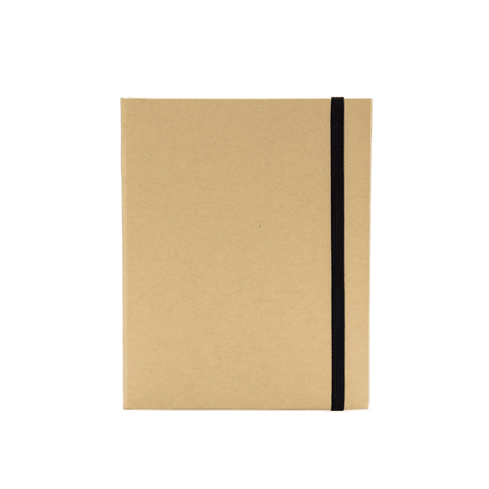 Bloco de anotações com capa dura em kraft e fechamento por elástico. Possui aproximadamente 80 folhas de tonalidade marfim sem pautas e cinco canetas coloridas de ponta dupla: uma fina e outra tipo pincel.