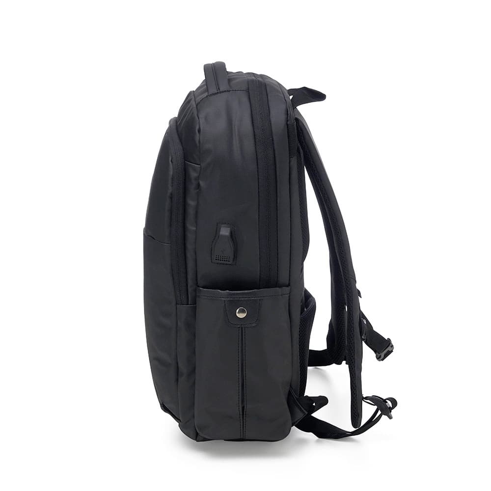 Mochila em couro sintético 20 litros resistente à água com quatro compartimentos, sendo o principal com bolso para notebook até 14 polegadas e um exclusivo com proteção contra furto. Com divisórias internas para acessórios, a mochila possui bolsos laterais, suporte externo USB, duas alças de mãos, alça para encaixe em malas de viagem e área costada com revestimento espumado.